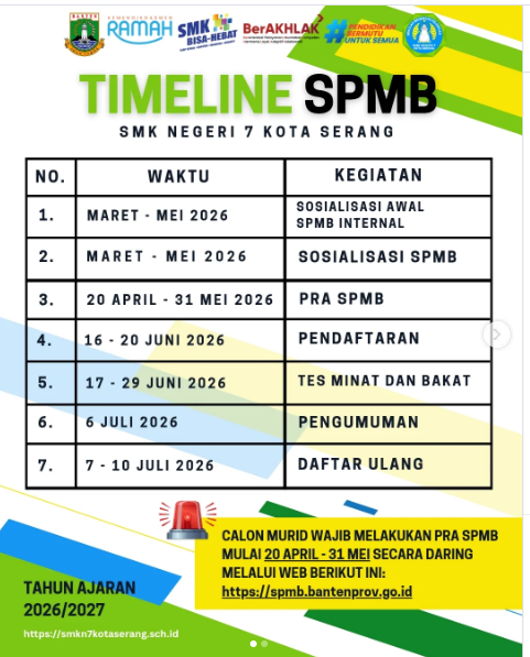 | PRA SPMB | Pra SPMB wajib di ikuti oleh siswa-siswi tingkat SMP/MTs /Sederajat yang akan melanjutkan ke jenjang SMA/SMK, bila anda tidak ikut PRA -SPMB, anda nanti tidak bisa daftar ke jenjang SMA/SMK, jadi wajib ya, pendaftaran PRA SPMB anda hanya memilih sekolah, bebas, mau SMA atau SMK, tidak /belum memilih jurusan, selesaikan ya pendaftaran PRA SPMB sampai akhir, hingga anda mendapat TOKEN. |